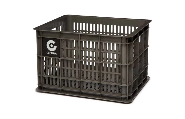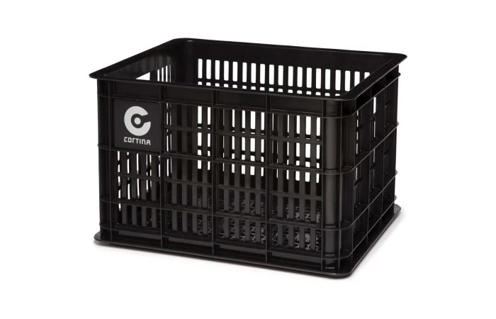 Verkrijgbaar in de kleur zwart en bruin/grijs. Het krat heeft een gaaf reflecterend Cortina-logo.