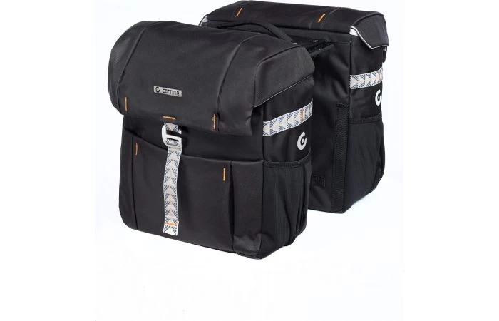 Cortina Fietstas dubbel Nice AVS zwart. Dubbele afneembare fietstas met kliksysteem geschikt voor het AtranVelo System (AVS) en passend op de Cortina Common en E-Octa achterdragers. Gemaakt van waterafstotend polyester in de kleur zwart. Eenvoudig en snel afneembaar. Hoofdvak met extra kleinere vakken en reflecterende opdruk.