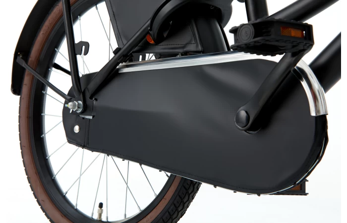 De ketting wordt beschermd door een solide kettingkast. De jasbeschermers voorkomen dat de kleding van de fietser in de spaken terecht komt. De fietsbel is superhandig voor als je erlangs moet!