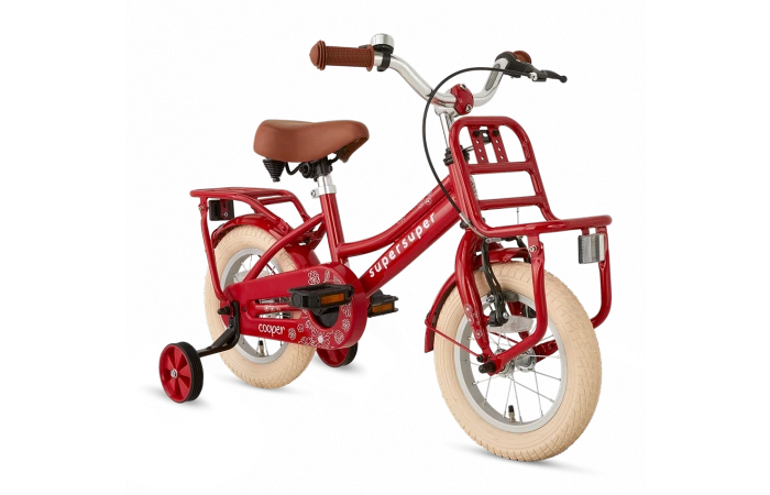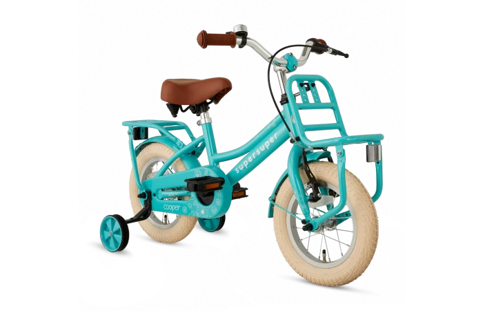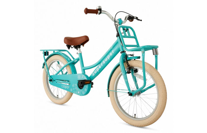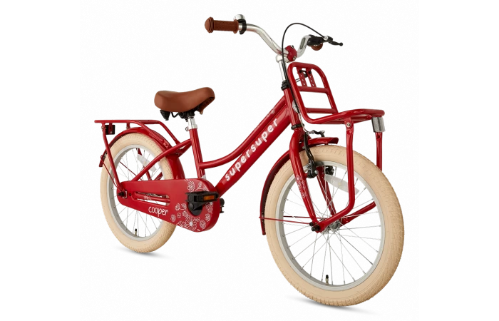 De Cooper fiets is voorzien van metalen spatborden, een dichte kettingkast en reflectoren voor en achter. En de fiets lijkt al best wel veel op een grote mensenfiets, zo met de voor- en achterdrager. Het bruine leatherlook zadel en handvatten geven de fiets een eigentijds accent.