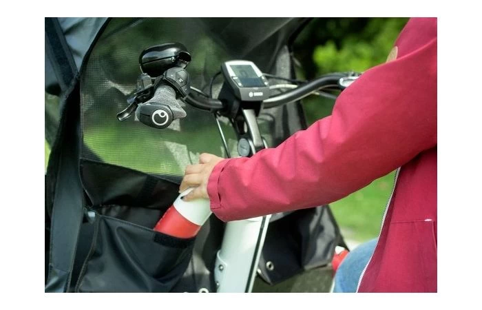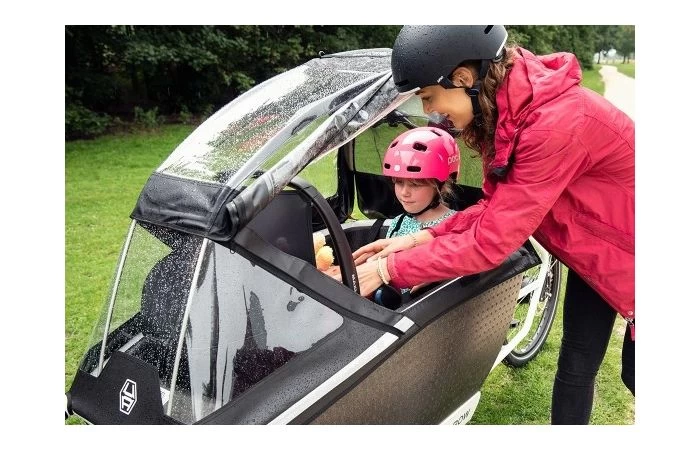 De voorkant van de regenhuif biedt significant meer ruimte voor de passagiers die op het extra voorbankje zitten. Mochten jouw kleintjes nou nog te jong zijn om zelfstandig op het bankje te zitten dan is daar ook aan gedacht. De Raincover PLUS biedt namelijk ruimte en een eenvoudige toegang om een Maxi-Cosi stoeltje in en uit de bak te halen. Zo kun je met gemak zelfs je jongste meenemen op al je ritjes. Â