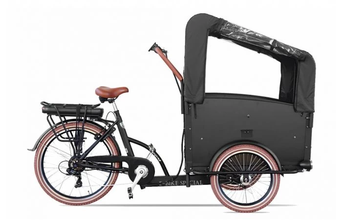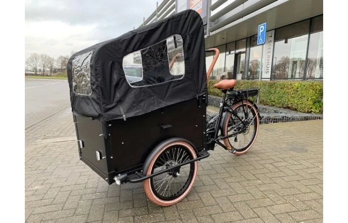 De Troy E-bike bakfiets kan worden ge-upgrade met verschillende accessoires, een bakfietshoes, een fietstas en een extra slot.