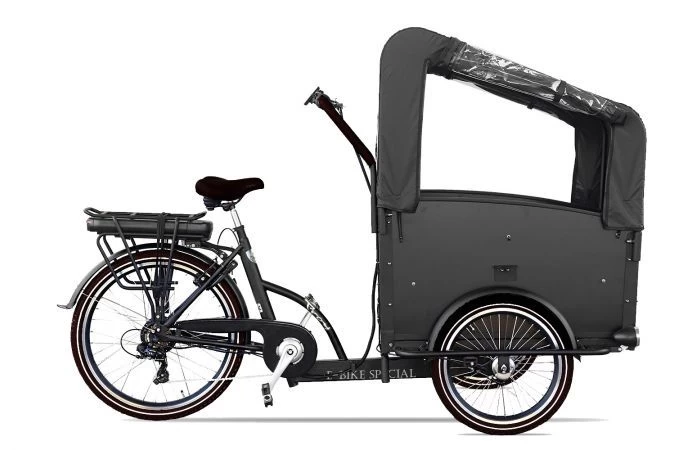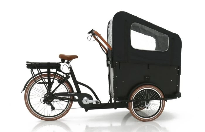 De Troy E-bike bakfiets kan worden ge-upgrade met verschillende accessoires, een bakfietshoes, een fietstas en een extra slot.