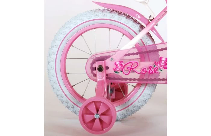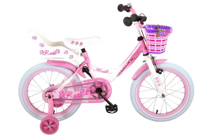 Deze mooie Volare Rose fiets is een échte meisjesfiets. In prachtige kleurstelling roze met een meisjesachtig bloemetjesdecor. Deze fiets is met zijn afneembare zijwieltjes een ideale fiets om op naar school en vriendinnetjes te fietsen. De fiets is voorzien van een sterk en modern U-vormig frame, afneembare zijwieltjes, fietsbel en hand- en terugtraprem. De handvaten van de fiets zijn feestelijk versierd. Verder heeft de fiets een poppenzitje en een fietsmandje zodat elk meisje haar poppen overal mee naar toe kan nemen, maar tegelijkertijd haar handjes veilig aan het stuur kan houden. De kettingkast is ter bescherming van de kleine vingertjes volledig gesloten. Welk meisje wil deze fiets nu niet? Deze fiets is voor 95% afgemonteerd, dus bijna fietsklaar.Â